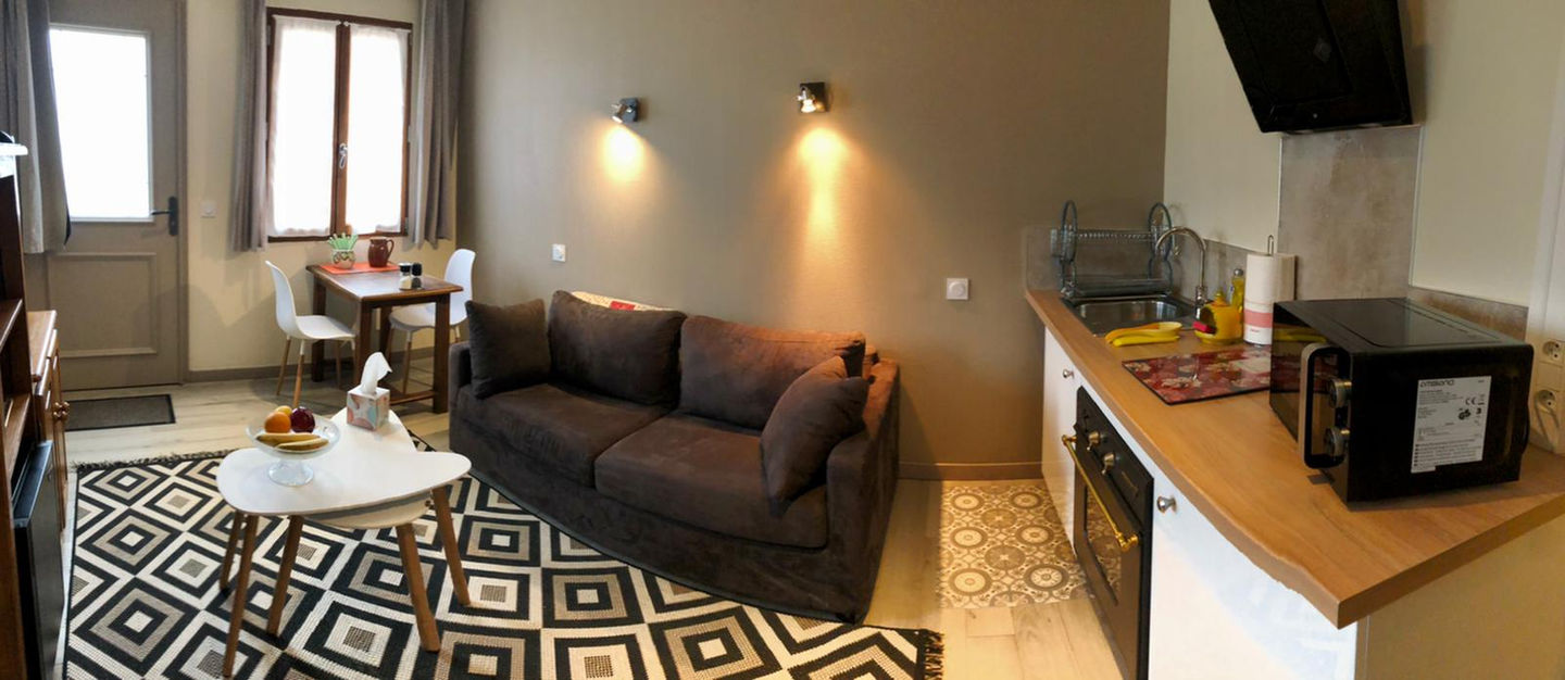 Cet appartement est sur 2 niveaux. Au rez-de-jardin, vous trouverez un coin cuisine équipée avec coin repas et un salon avec un canapé lit.